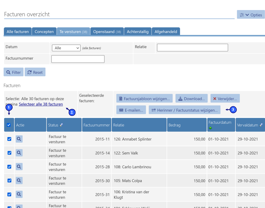 Op het moment dat de factuur na de aangegeven vervaldatum nog niet is betaald, heb je de mogelijkheid om een herinnering te laten genereren. Dit wordt gedaan in het factuuroverzicht, door de facturen te selecteren en vervolgens op de knop ‘Herinnering’ te klikken. Dan worden de herinneringen gegenereerd en kan de gebruiker op dat moment deze weer mailen richting de relaties.